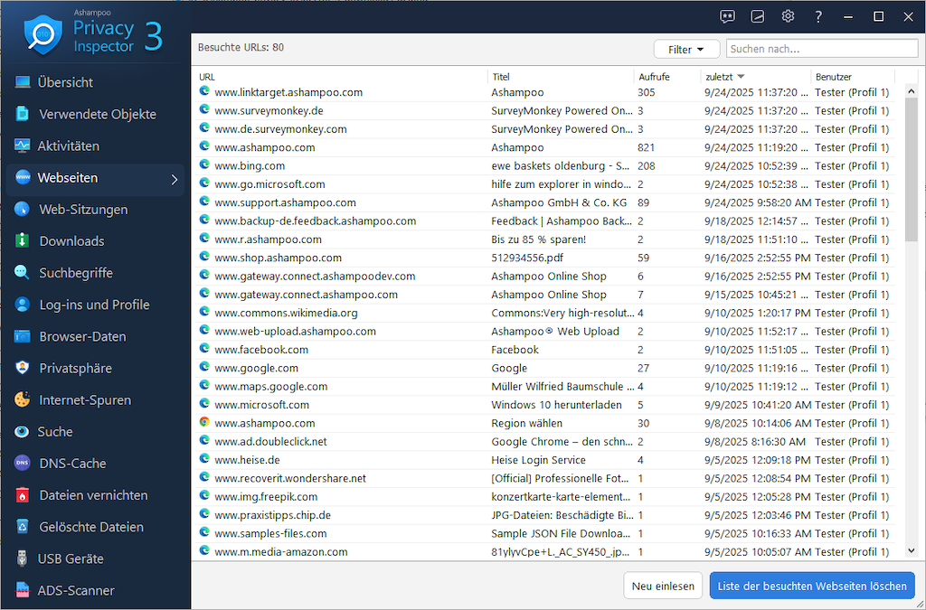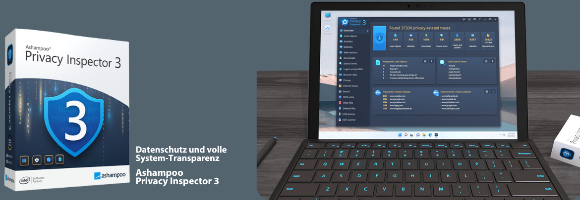 Ashampoo Privacy Inspector 3 bietet umfassende Einblicke in die Aktivitäten und gespeicherten Daten unter Windows. Die Software zeigt detailliert an, welche Programme, Dateien und Internetseiten genutzt wurden, analysiert Surfverhalten, Downloads, Suchanfragen und Formulareingaben und macht so sichtbar, welche Informationen über die Nutzung des PCs vorliegen.