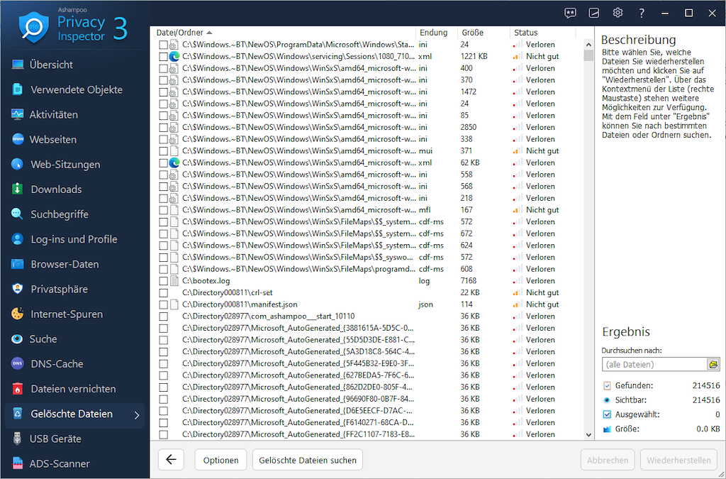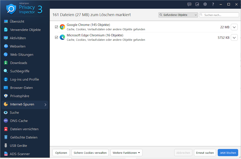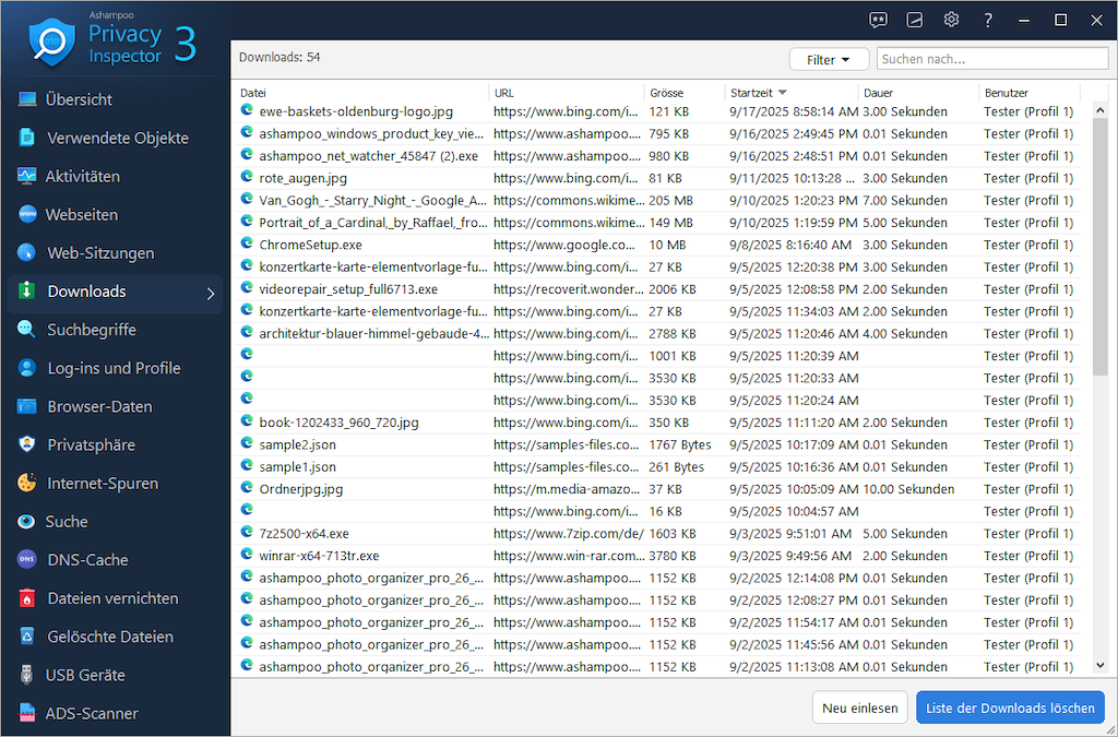 Dank zahlreicher Filter lassen sich Ergebnisse schnell eingrenzen und gezielt untersuchen. Neben der Analyse sorgt Privacy Inspector auch für mehr Sicherheit: Browserdaten, Internetspuren, Logins oder Nutzungsprotokolle können zuverlässig gelöscht werden, Telemetrie und unerwünschter Datenversand lassen sich einschränken und sensible Dateien mit dem File Wiper unwiderruflich entfernen.
