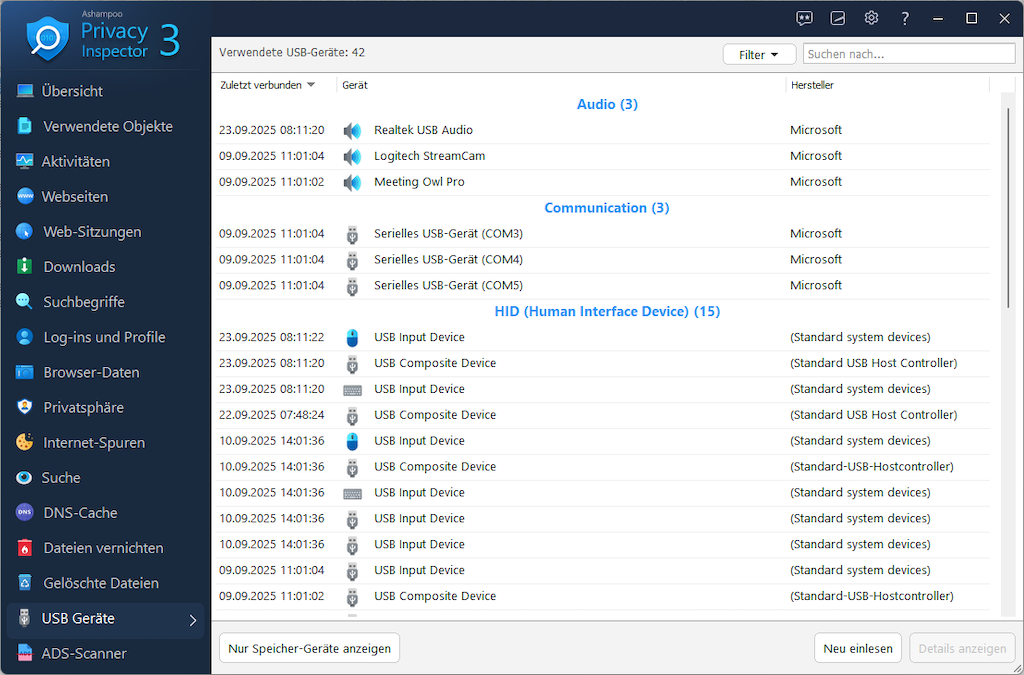 Die neue USB-Geräte-Übersicht zeigt an, welche Speichermedien jemals am PC angeschlossen waren und wann sie zuletzt verbunden wurden. Der integrierte ADS-Scanner spürt unsichtbare Alternate Data Streams auf und erlaubt das sichere Entfernen fragwürdiger Einträge. Außerdem wurde das Aktivitäten-Modul um zusätzliche Datenquellen erweitert und die Analyse durch optimierte Mehrkernunterstützung deutlich beschleunigt. So liefert Ashampoo Privacy Inspector 3 noch schneller umfassende Ergebnisse.
