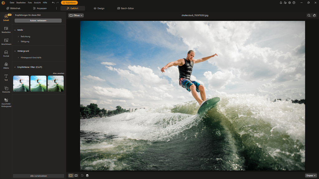 Verbessern Sie Ihre Bildqualität automatisch, retuschieren Sie Gesichter und Körper professionell, entfernen Sie störende Objekte mühelos oder tauschen Sie Hintergründe im Handumdrehen aus.