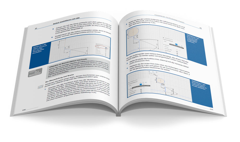 Der Praxisteil enthält umfangreiche Tutorials zu den 3D-CAD-Programmen TinkerCAD, FreeCAD sowie Fusion 360. Damit steigen Sie in das Modellieren ein und lernen an Beispielen mit unterschiedlichem Schwierigkeitsgrad die Arbeitsweise der 3D-Modellierung kennen, sodass Sie Ihr eigenes Modell erstellen können. Beispielmaterial und Übungsdateien werden als Download zur Verfügung gestellt.
