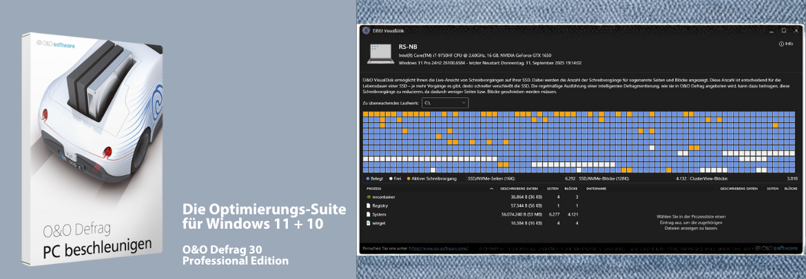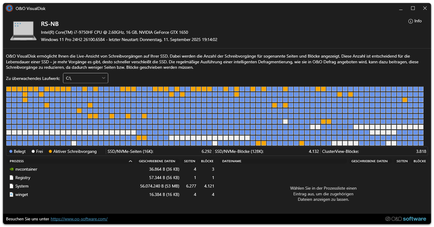 Mit O&O VisualDisk werden Schreibzugriffe auf die Festplatte, wie sie auf flashbasierten Speichermedien wie SSDs und NVMe-Laufwerken stattfinden, anschaulich dargestellt.
