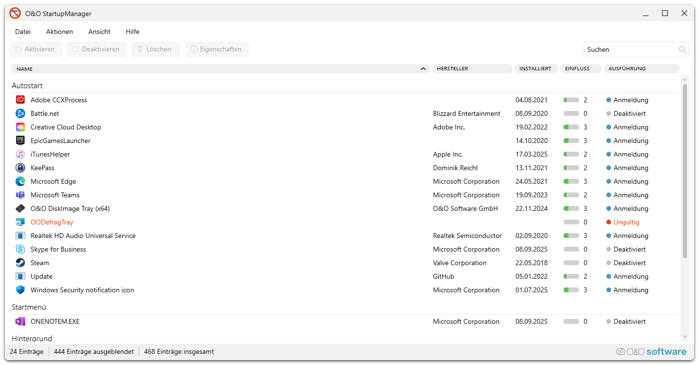Der neue O&O StartupManager bietet eine klare Übersicht über alle Programme, Aufgaben und Dienste, die automatisch beim Start von Windows ausgeführt werden. Mit detaillierten Informationen zu jedem Programm – einschließlich des Einflusses auf die Startzeit des Systems – kann ganz einfach entschieden werden, welche Programme aktiviert oder deaktiviert sein sollen.