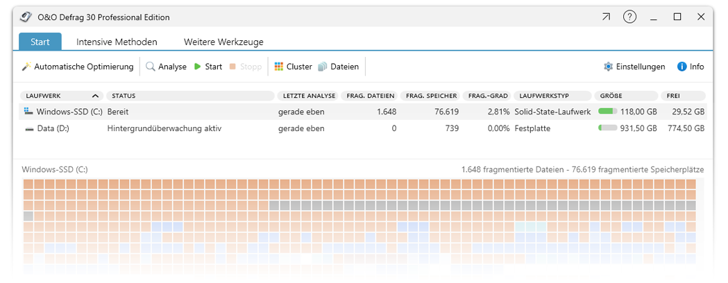 O&O Defrag räumt diesen Schuhkarton auf, indem es die Schnipsel einer Datei zusammenfasst und hintereinander auf die Festplatte oder SSD schreibt. Zusätzlich werden die Dateien reorganisiert, so dass die Zugriffszeiten beim Laden minimiert werden. So sparen Sie Zeit und schonen Ihre Datenträger. Bei regelmäßiger Anwendung von O&O Defrag erhöht sich die Zugriffsgeschwindigkeit und die Gesamtperformance Ihres Windows-Systems merklich. Und damit Sie sich auch nie mehr Gedanken über „Dateischnipsel“ machen müssen, kann O&O Defrag auch vollkommen automatisch im Hintergrund ausgeführt werden.