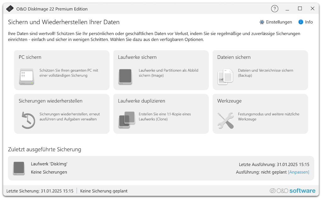 Mit nur einem Klick kann die Sicherung des gesamten Rechners gestartet werden. Die Ein-Klick-Sicherung eignet sich besonders, wenn O&O DiskImage das erste Mal benutzt wird oder bisher noch keine Sicherung des Rechners angelegt wurde.