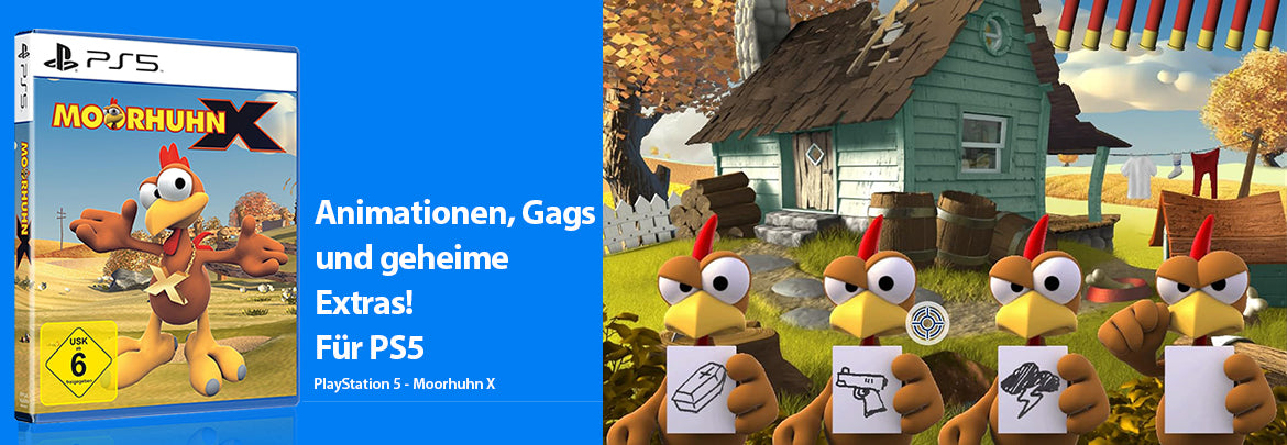 Erlebe mit Moorhuhn X für die PlayStation 5 die Neuauflage des beliebten Kultspiels in modernster Grafik und mit noch mehr verrücktem Hühnchenspaß.
