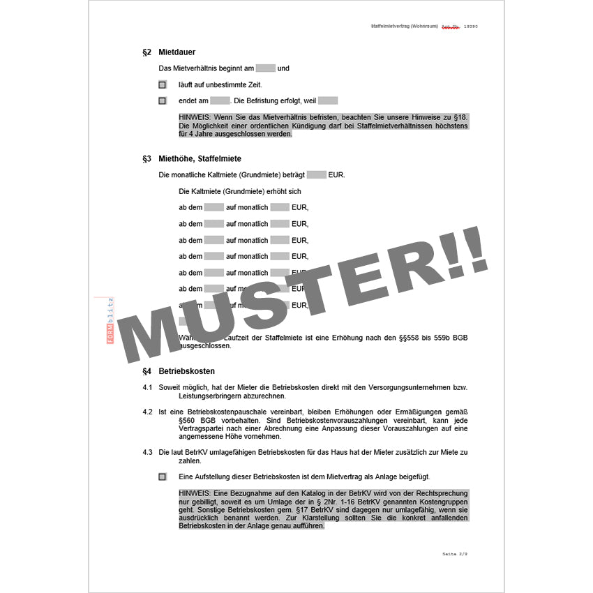 Nutzen Sie unser Muster im PDF- und Word-Format, das neben der Staffelregelung alle Standardklauseln eines Mietvertrags enthält, für eine sichere Vermietung.
