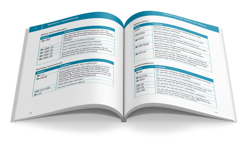 Es umfasst alle nennenswerten Shortcuts sowohl für die Windows-Standardaufgaben und Zubehörprogramme als auch für die Office-Programme Word, Excel, PowerPoint, Outlook, Teams, OneNote und die Windows-Zubehörprogramme.